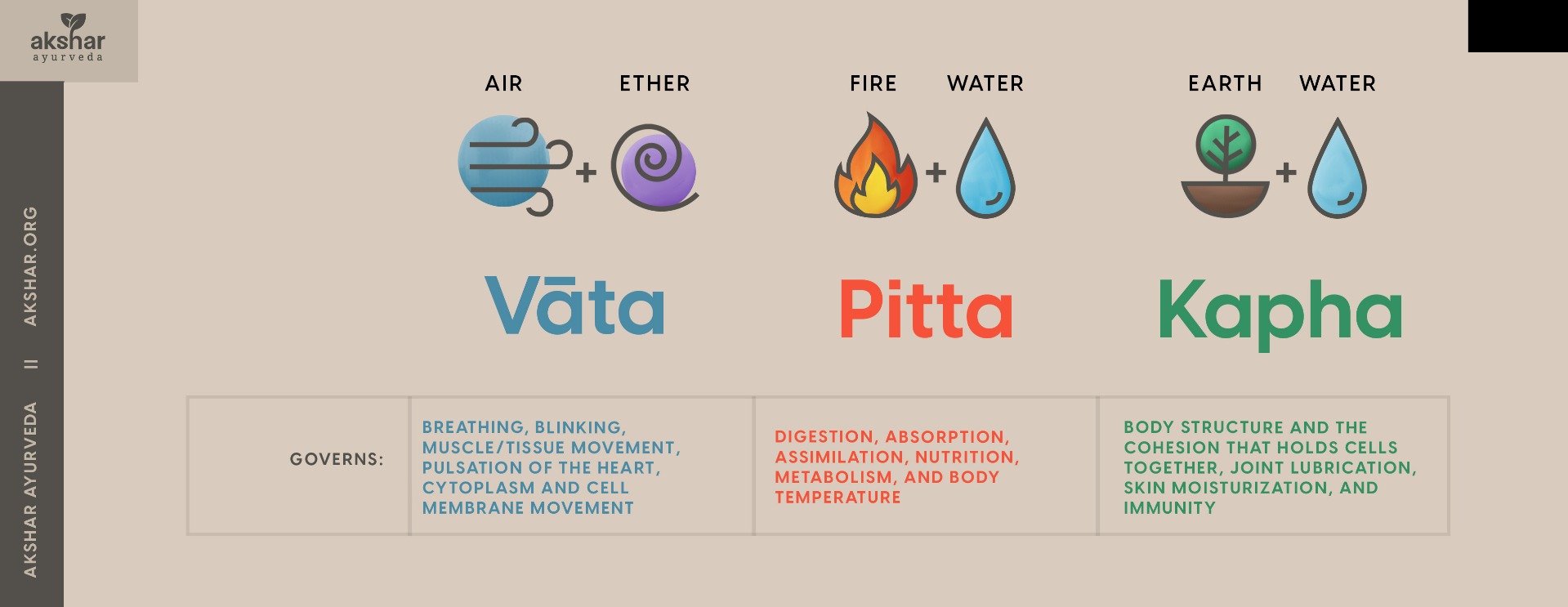 According to Ayurvedic philosophy, vāta, pitta, and kapha are necessary energy complexes that form the foundation of our physiology – each serving a different, but vital function. Vāta is the energy of movement; pitta is the energy of digestion and metabolism; and kapha is the energy of structure and lubrication. Each dosha is composed of the five basic elements (ether, air, fire, water, and earth) that make up the entire cosmos. Two of these elements predominate in each dosha: